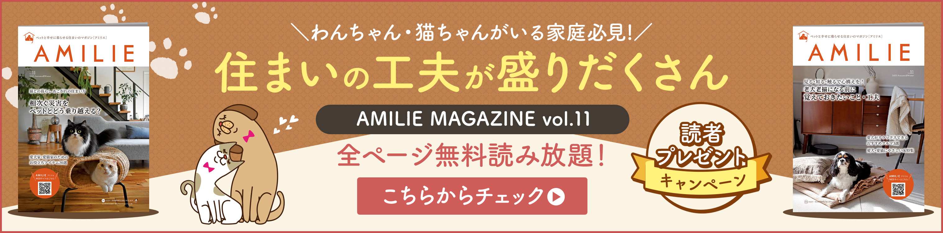 AMILIE(アミリエ)はペット愛好家がペットと幸せに暮らす家を探せるサイトです。これから住まいを探そうとしている方、住まいを建てようとしている方、リフォームしようとしている方、将来ペット向けに住まいを検討している方に役立つ情報をお届けします。ペット愛好家の方は無料でご利用いただけます。ペットと暮らすための工夫が盛り沢山のおうちをご覧いただけます。