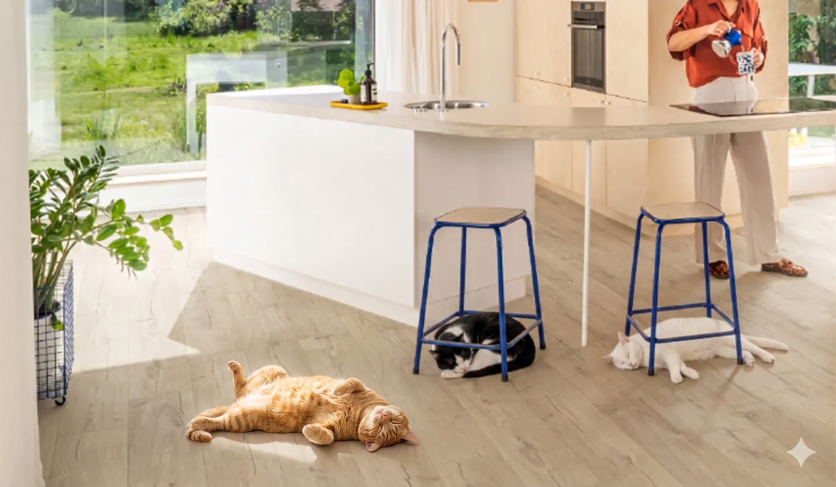 高い耐久性とメンテナンス性を備えたラミネートフロアは、傷がつきにくく臭いも染み込みにくいため、犬猫と暮らす家庭におすすめの床材です。