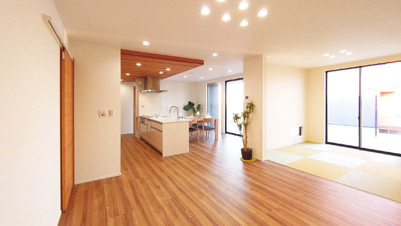 リビングやウッドデッキとフラットにつながる畳スペースは、客間や昼寝など多用途に使える。