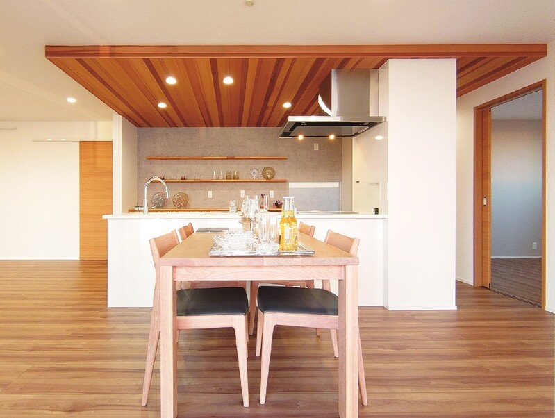 キッチンの天井を板張りにして、一体感を持たせたままアクセントをプラス。