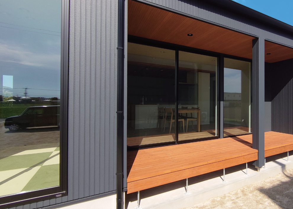 軒を深く取ることで、ウッドデッキが屋根付きのインナーバルコニーのような空間に。夏の強い日差しをほどよく遮ってくれる。