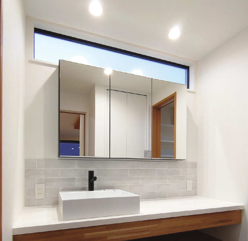 造作の洗面カウンターはシンプルで飽きが来ないデザイン。