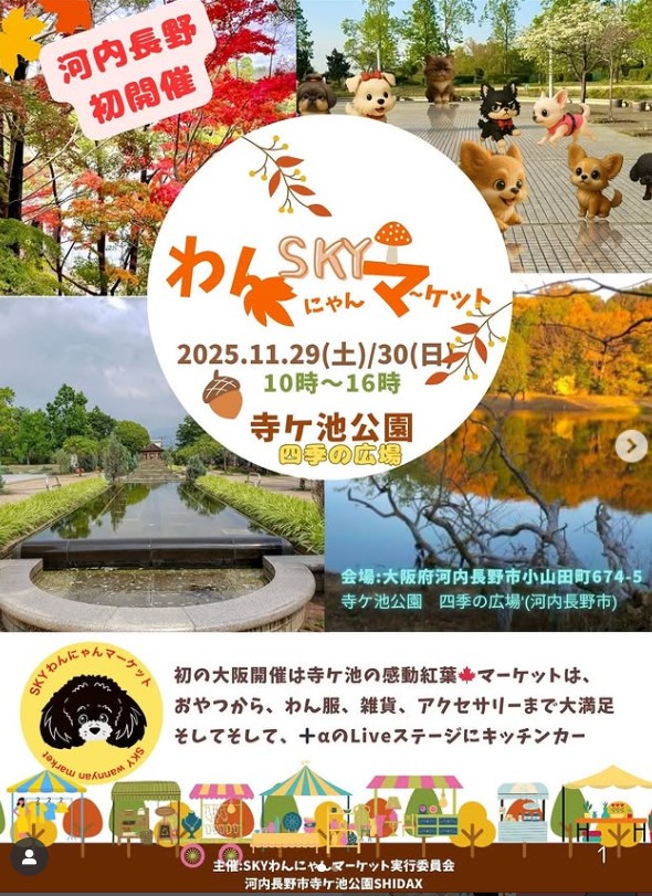 詳細:本年度最後の伊丹が終わったら、初開催の河内長野寺ケ池公園になります♪おやつから、わん服、雑貨、アクセサリーまで大満足🐶
