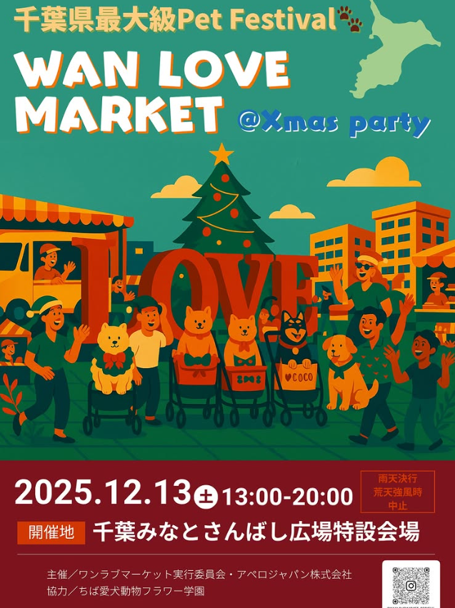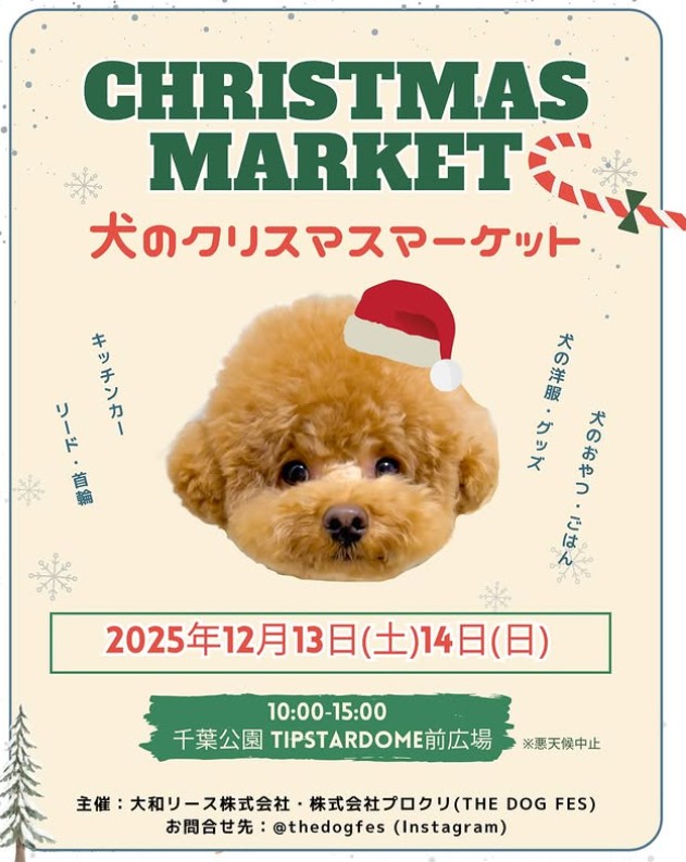 詳細:今年最後のイベントは大人気の千葉公園で開催いたします🪅❕美味しいおやつなどのマルシェが大集合🐶大人気の写真映えスポットも📸🎄✨皆様のご来場心よりお待ちしております✨