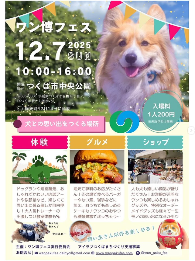 詳細:きたる12/7(日)に、つくば中央公園にてワン博フェス開催します✨ドッグランや短距離走、おしゃれでかわいい肉球アートなどや似顔絵など、たくさんのコンテンツが目白押し💑人も犬も嬉しい標品も盛りだくさん🐶そして地元で評判のおいしいグルメもたくさんあります✨雨降りませんように!そしてたくさんの方にお越しいただき、楽しんでいただけますように💛🐕✨
