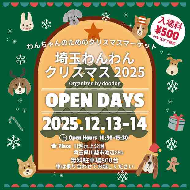 詳細:会場は、川越水上公園の駐車場です🎄大きなプールや桜並木など、どの季節に立ち寄っても楽しい公園で、わんちゃんのイベントを開催いたします!