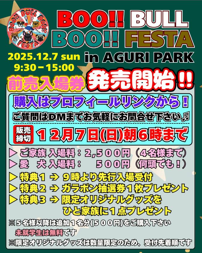 入場料:前売入場チケット 発売開始のご案内です!◯ ご家族入場券:2500円(ひと家族4名様まで)◯ 愛犬入場券: 500円(愛犬何頭でも)※5名様以降は追加1名分(500円)をご購入下さい。