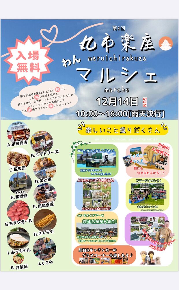 詳細:第8回丸市楽座わんマルシェ開催〜❣️愛知県犬山市最大級のマルシェ!!マルシェと犬山城下町ダブルで丸一日楽しめる♬ぜひこの市場でワイワイ楽しみましょう🐶✨
